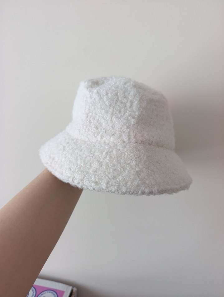Beyaz renkli, yumuşak ve peluş dokulu, kürk detaylı kadın şapkasıdır. Streetwear tarzına uygundur. sıfır temiz