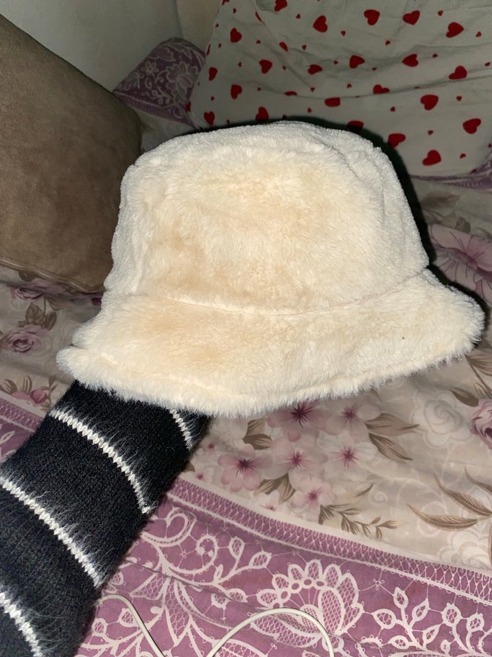Yumuşak peluş kumaştan, kürk detaylı beyaz kova şapka. Rahat ve retro bohem tarzı yansıtıyor.