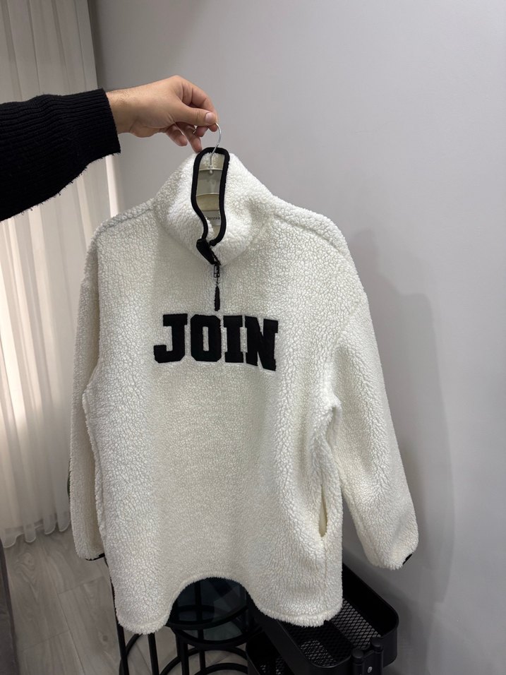 Yüksek yakalı, uzun kollu ve bol kesim beyaz peluş kadın sweatshirt. Önünde 'JOIN' baskısı ve yumuşak tüylü dokusu bulunur.