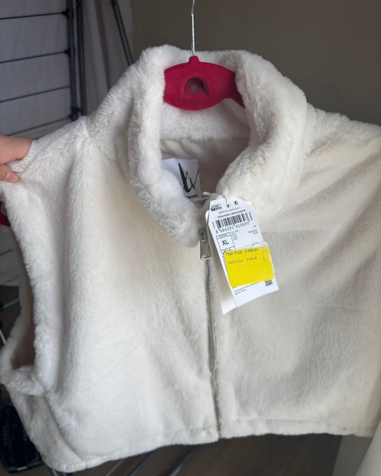 Yüksek yakalı, beyaz ve peluş dokulu, rahat kesim kolsuz kadın yelek. Günlük sokak stiline uygun, sıcak tutan kürk detaylı tasarım.
