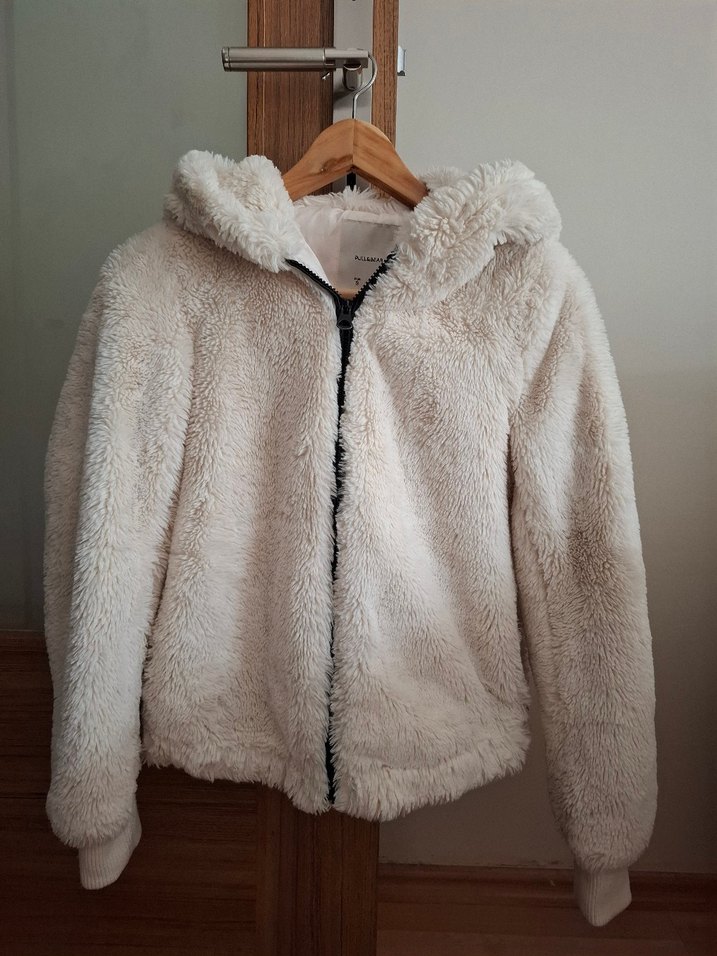 Uzun kollu, kapüşonlu ve bol kesim beyaz kadın ceketi. Yumuşak peluş kumaştan yapılmış, rahat ve günlük kullanıma uygun.