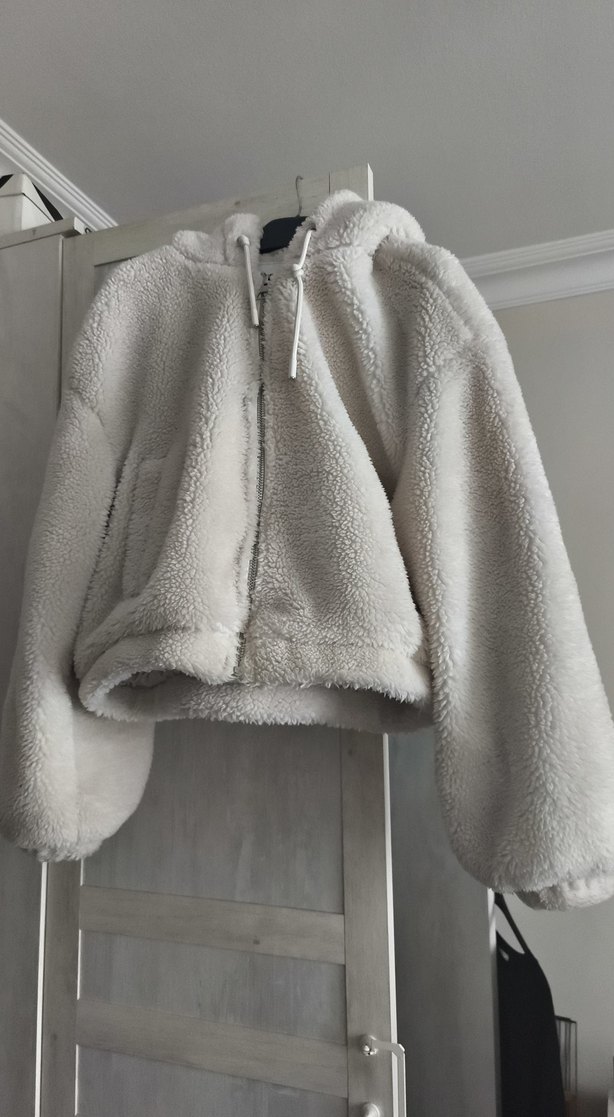 Yumuşak ve sıcak kumaştan, uzun kollu, kapüşonlu, bol kesim kısa uzunlukta beyaz peluş kadın mont. Sokak stiline uygun, kürk detaylı.