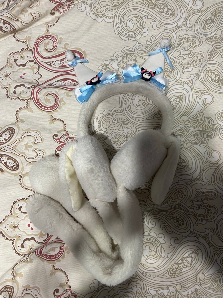 Pastel mavi kurdeleler ve küçük süslemelerle yumuşak beyaz peluş kedi aksesuarı. Rahat ve sevimli bir ürün.