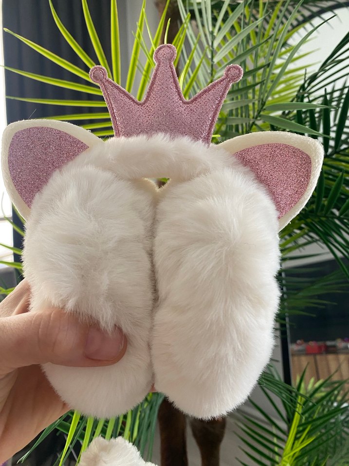 Pastel pembe kulaklar ve taç detaylı, yumuşak beyaz peluş kedi kulaklığı.
