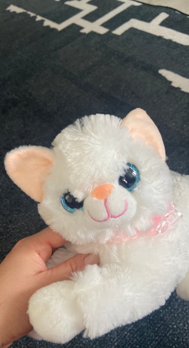 Yumuşak beyaz peluş kedi oyuncak, pastel pembe kulaklar ve sevimli yüz ifadesiyle. Sarılmak için uygun.