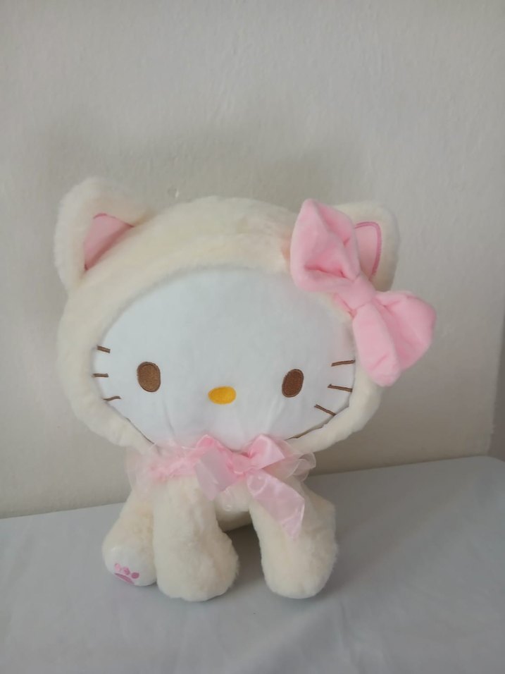 Pastel pembe fiyonk detaylı, beyaz yumuşak ve peluş kedi oyuncak