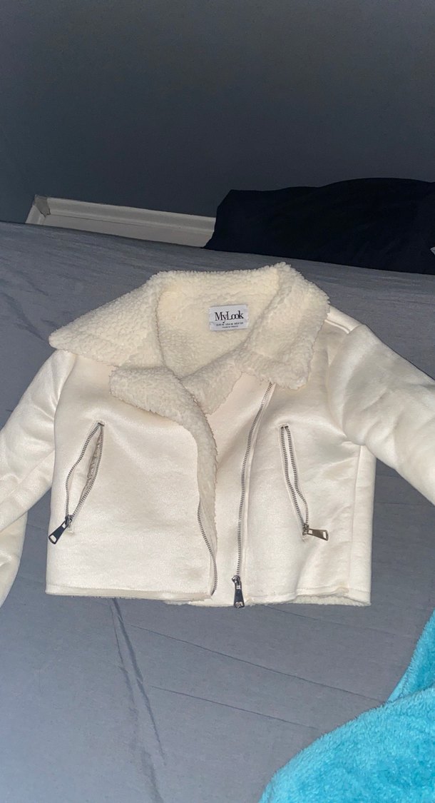 (ürün indirimi tekliflerine açık değilim maalesef☺️)Yumuşak peluş kumaştan yapılmış, kürk detaylı ve kısa kesim beyaz, uzun kollu, kesimli kadın ceket. Düz ve fermuarlı ceplidir. Marka etiketi 'mylook' yazıyor. ❄️