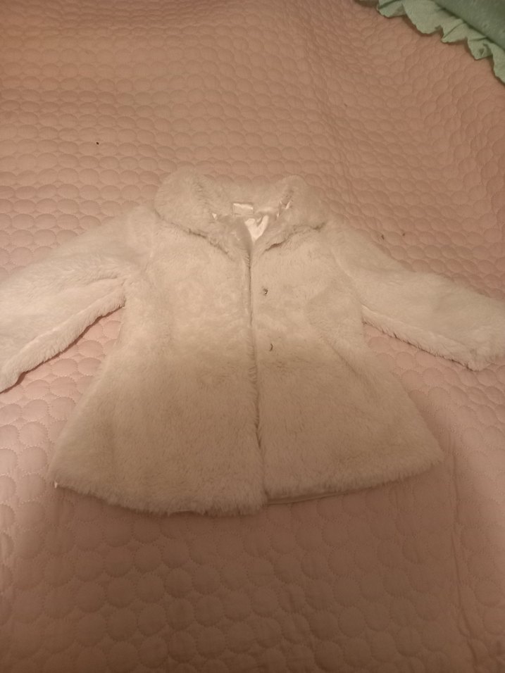 Beyaz peluş kaban, yakasında kürk detaylı ve uzun kolludur. Rahat kesim ve normal midi boydadır, yumuşak peluş kumaştan üretilmiştir. Günlük kullanıma uygundur. 9 aylik bebek kurk