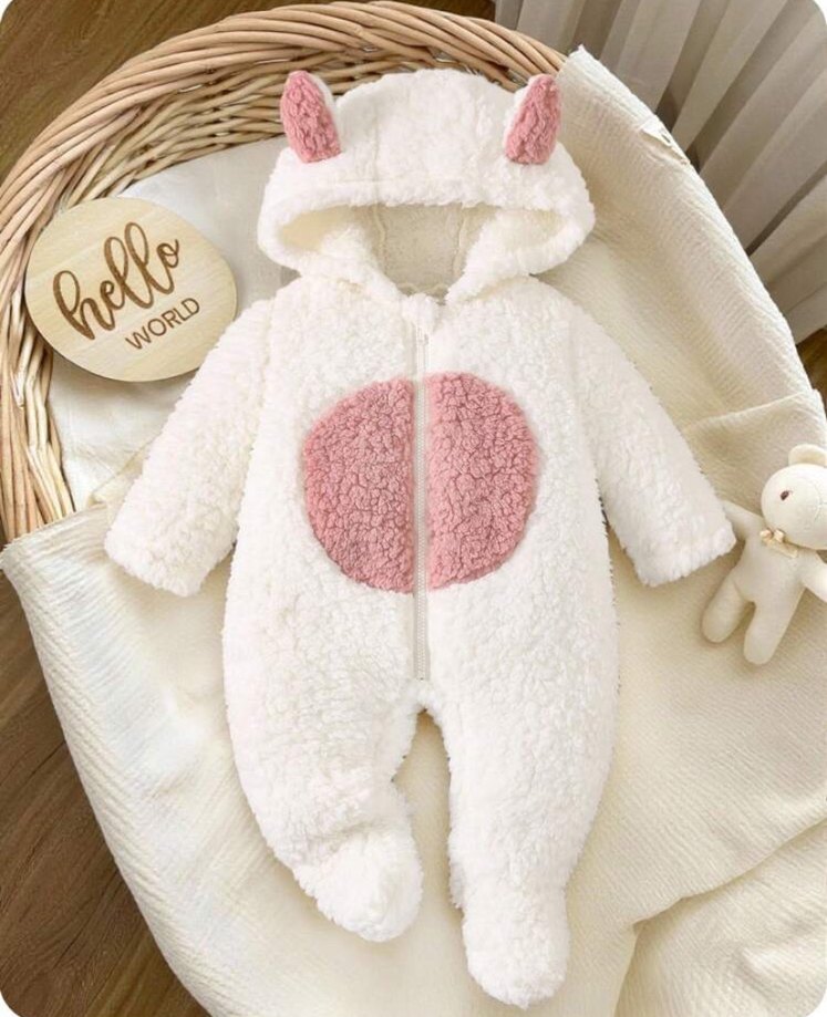 Yumuşak peluş detaylı beyaz bebek tulumu, Kapüşonunda kulaklar ve önde fermuar vardır. Yurtdışından geldi,,, Marka: SHEIN ,,, beden: 3-6 ay