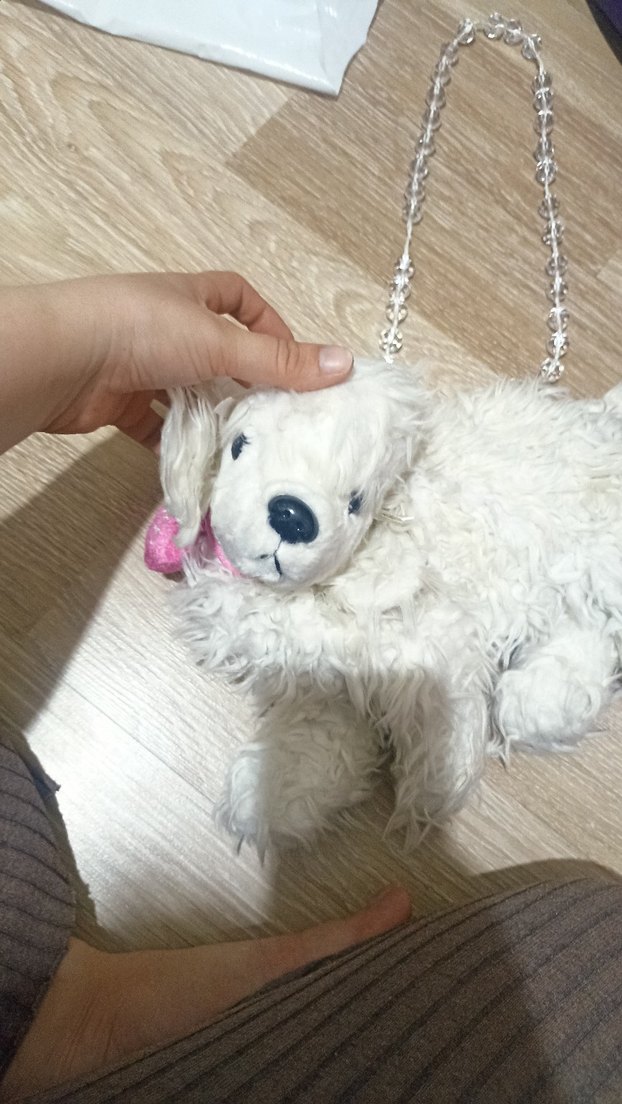 Zincir askılı, yumuşak kıvırcık tüylü beyaz peluş köpek çanta, boynunda pembe kurdele ile.