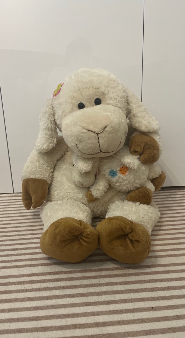 Yumuşak beyaz peluş koyun oyuncak, küçük bir koyun tutuyor, pastel renkler ve rahat bir dokuya sahip. 80 cm