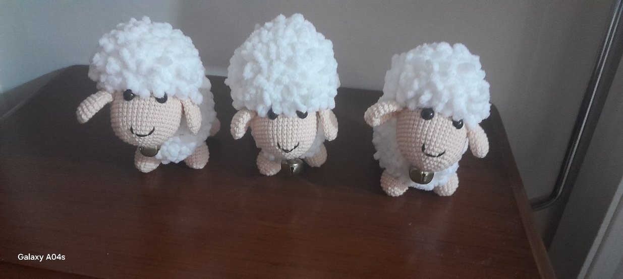 Yumuşak beyaz peluş koyun oyuncak, kabarık yün dokusuna ve boynunda küçük bir çanağa sahiptir. Sevimli yüz ifadesi ve pastel tonlar içerir.