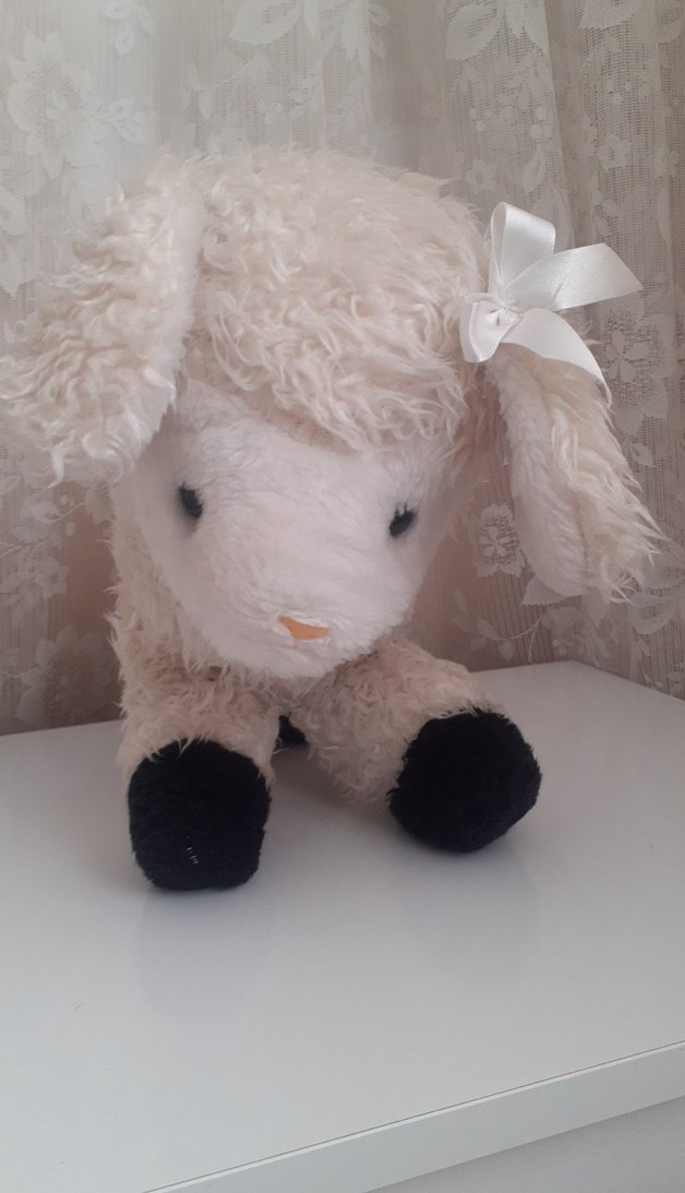 Yumuşak beyaz peluş kuzu oyuncak, bukleli dokusu ve kulağında kurdele fiyonk ile siyah ayaklara sahip nazik ifadeli oyuncak.