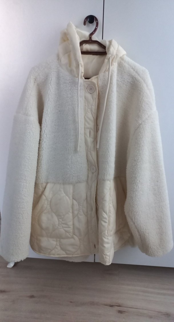 Beyaz peluş midi ceket, yumuşak kürk detaylı kumaş, bol kesim ve uzun kollu. Çentikli yaka ve kapitone alt kısım ile rahat sokak stili için ideal.