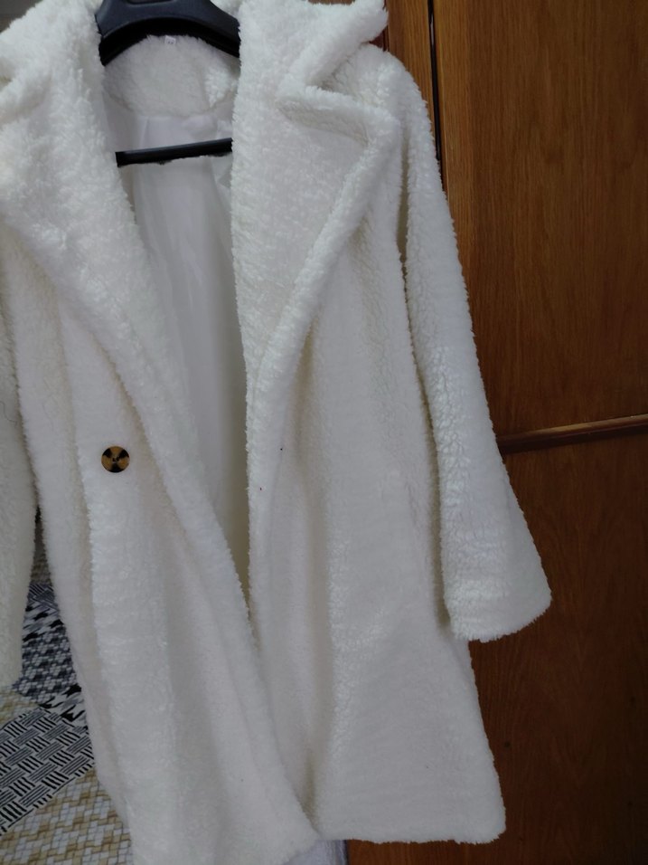 Beyaz renkli,peluş detaylı kadın kaban. Notlu yaka ve uzun kollu kaban . 1 kez giyildi temiz ve hasar yok .