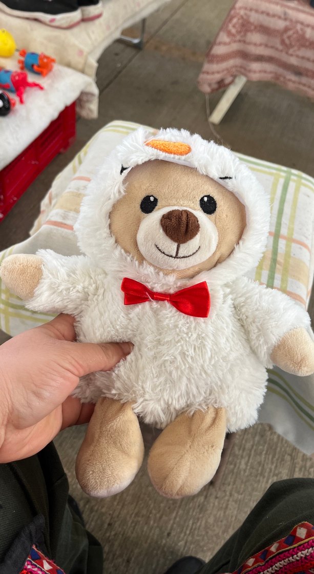 Yumuşak peluş ayı, beyaz tüylü kıyafet ve kırmızı fiyonk ile renkli detaylara sahip.