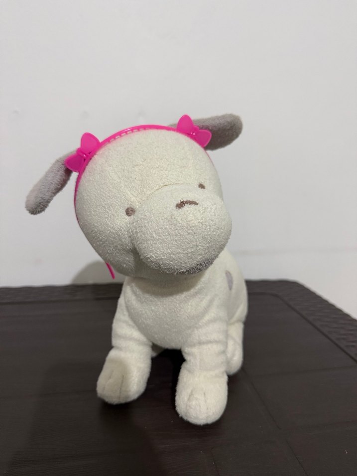 Pastel detaylara sahip yumuşak beyaz peluş köpek oyuncak, pembe fiyonk saç bandı ile süslenmiştir.