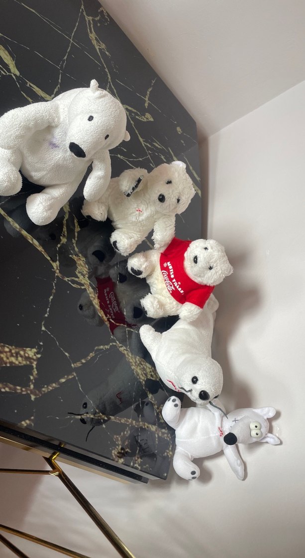 Yumuşak dokulu, kırmızı gömlekli ayı ve çeşitli hayvan figürlerinden oluşan beyaz peluş oyuncak seti. hepsi toplam 120 tl