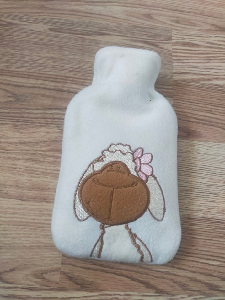 Beyaz peluş kaplamalı, sevimli hayvan figürlü çocuklar için sıcak su torbası.