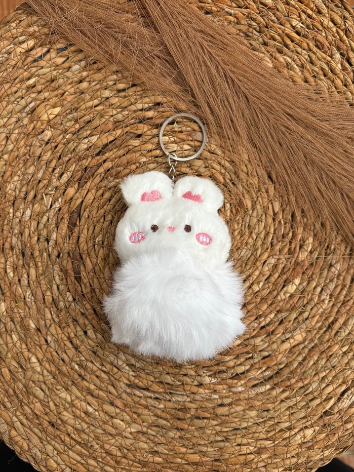 Yumuşak peluş detaylı beyaz tavşan figürlü anahtarlık, anahtarlarınıza rahat ve bohem bir hava katar.