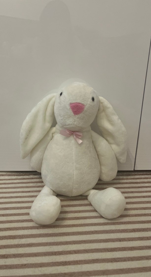 Yumuşak beyaz peluş tavşan, uzun kulaklı ve boynunda pastel pembe fiyonk ile. Sarılmak için ideal .45 cm