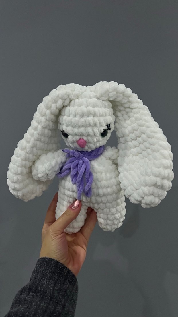 Uzun kulaklı, yumuşak beyaz peluş tavşan oyuncak, mor pastel atkı ile süslenmiş. Nakış işlemeli gözleri ve pembe burnu var.
