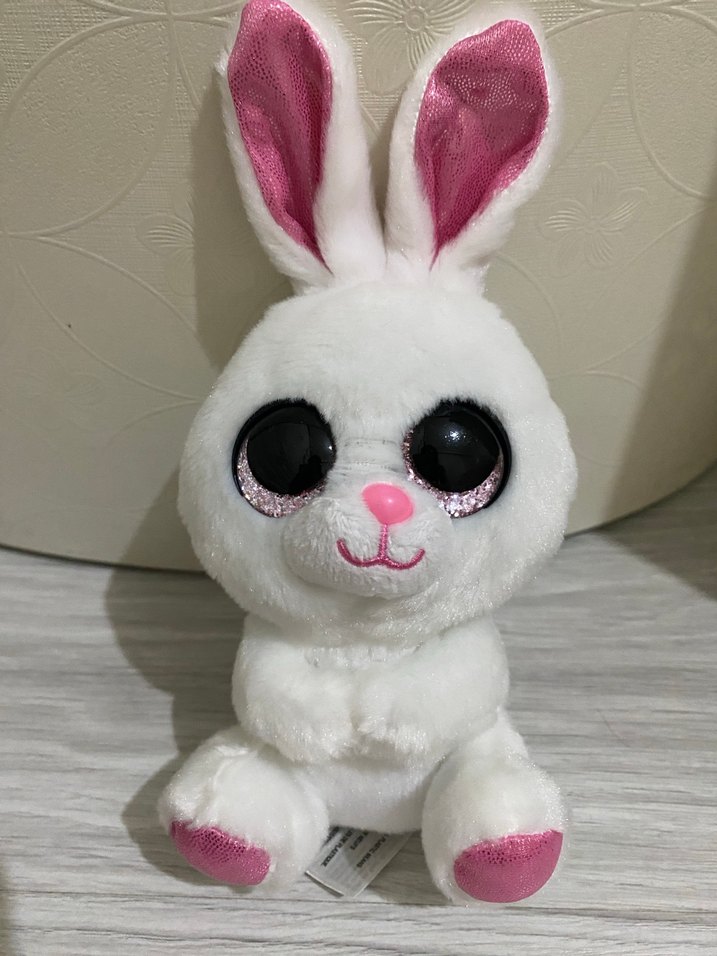 Yumuşak beyaz peluş tavşan, büyük simli gözler ve pembe kulak içi ile buruna sahip sevimli bir oyuncak.
