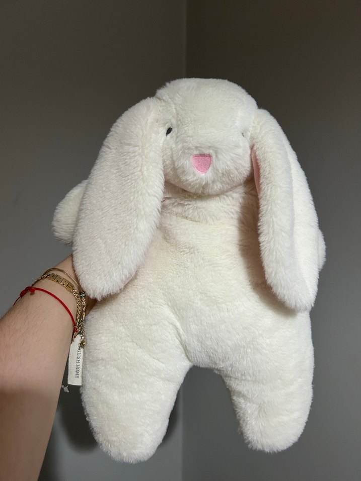Uzun kulaklı, pembe burunlu yumuşak ve pastel beyaz peluş tavşan oyuncak. Uyku arkadaşı