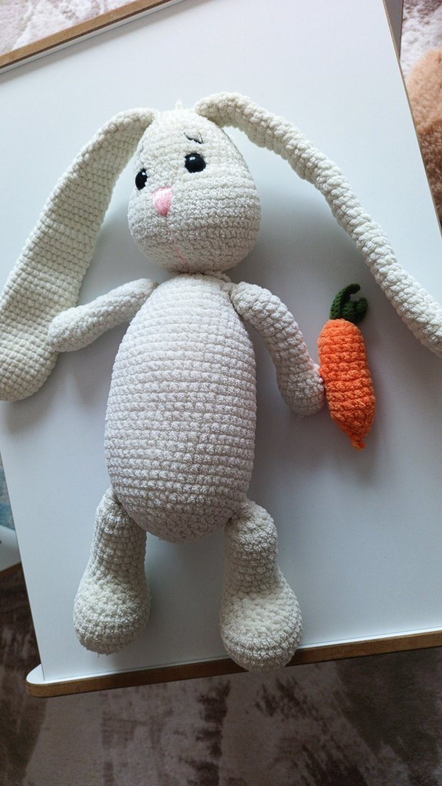 Pastel beyaz peluş tavşan oyuncak, uzun kulaklı ve küçük turuncu havuç tutuyor. Yumuşak dokulu ve el yapımı görünümlü.