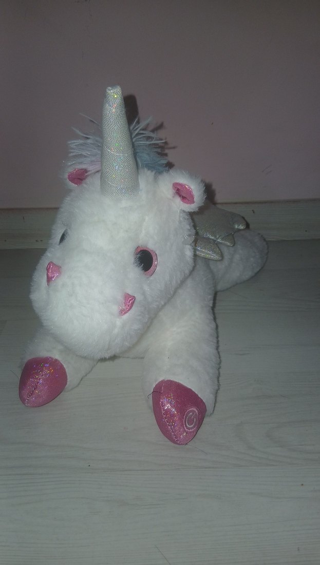 Yumuşak beyaz peluş unicorn oyuncak, pastel pembe detaylı ve parlak boynuzlu. Kanatları ve kabarık yelesi var, sarılmak için ideal . yep yeni defosuz pony