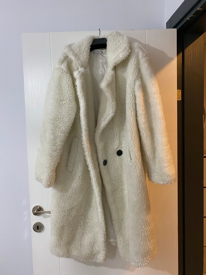 Bu beyaz uzun kaban, peluş kumaş ve kürk detaylara sahiptir. Geniş kesim, uzun kollu ve yaka tipi notched lapeldir. Rahat sokak stili için uygundur. M-L bedenle uyumludur
