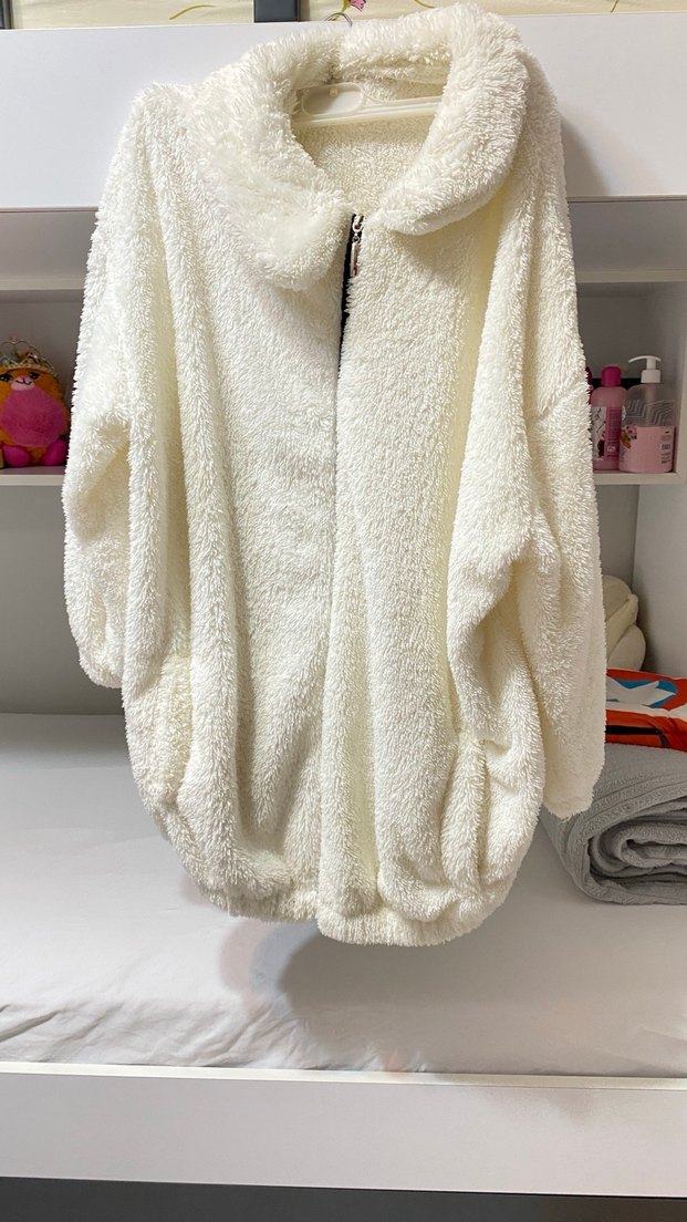 Beyaz peluş, kürklü detaylı, uzun kollu, yüksek yakalı ve bol kesim kadın ceket. Günlük kullanıma uygun, rahat ve sade tarz sunar.