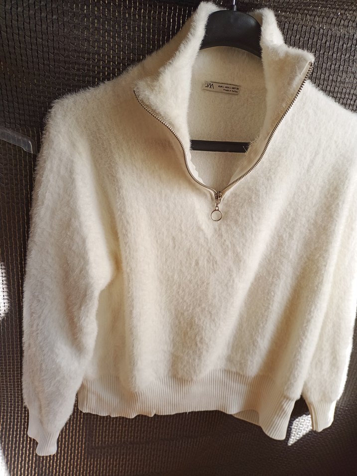Beyaz yumuşak peluş kumaştan, yaka kısmında kürk detaylı, uzun kollu ve bol kesim kadın kazak. Rahat ve günlük kullanıma uygun.