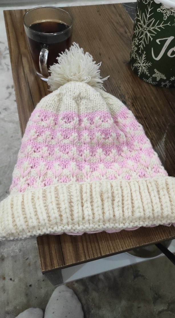 Beyaz ve pastel pembe renklerde, ponponlu, bohem tarzda örgü kadın bere.
