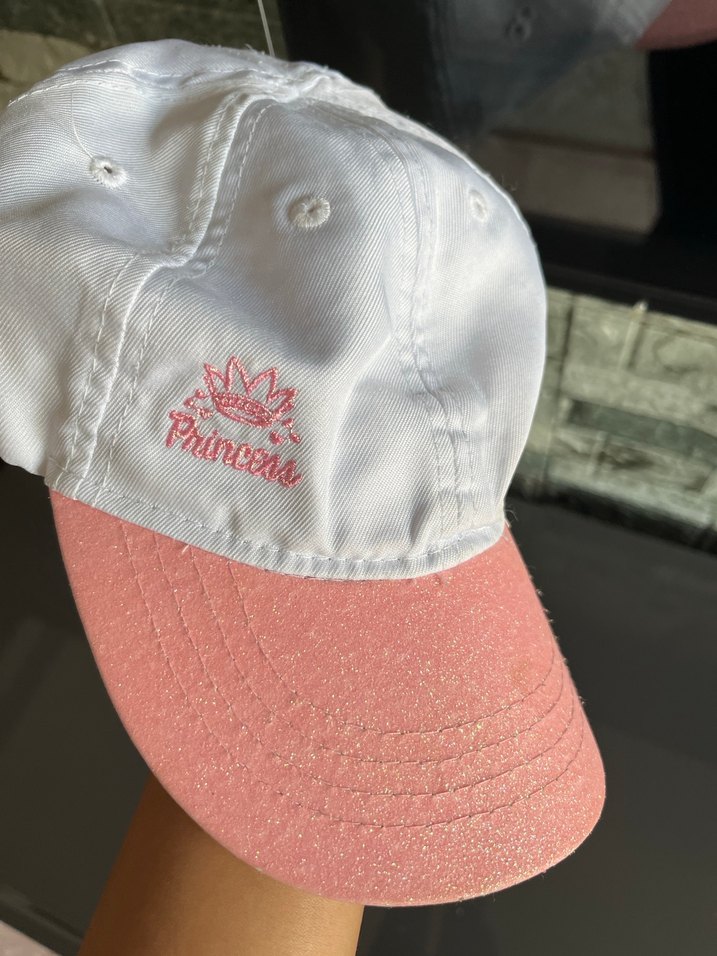 Beyaz ve pastel pembe renklerde, 'Prenses' nakışlı, yumuşak sentetik kumaştan çocuk şapkası.