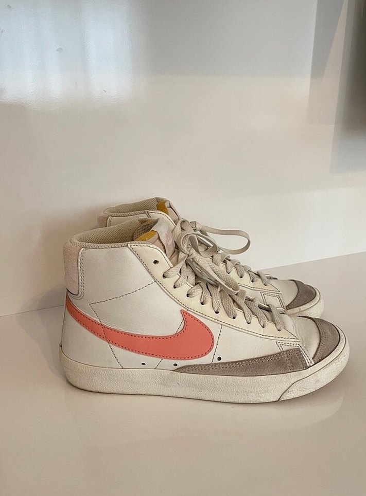 pembe baskılı detaylara sahip beyaz bağcıklı spor ayakkabı, lastik tabanlı ve ince topuklu, sportif sokak stili için uygun.