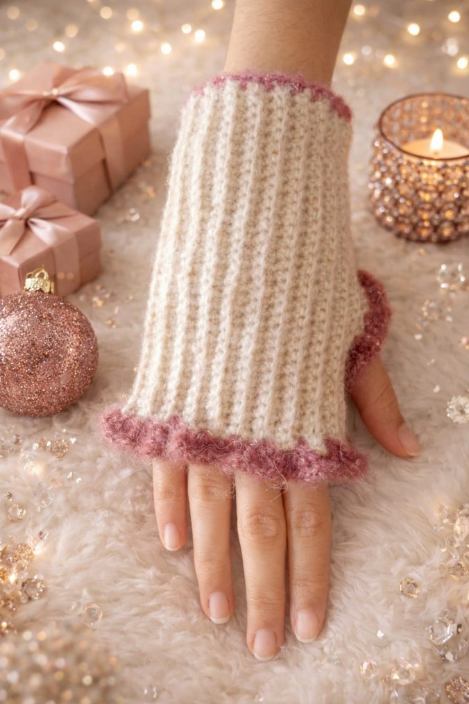 Beyaz renkli, pembe fırfırlı kenar detaylı örgü eldivenler. Parmakları açık, rahat ve bohem tarzda tasarlanmıştır.