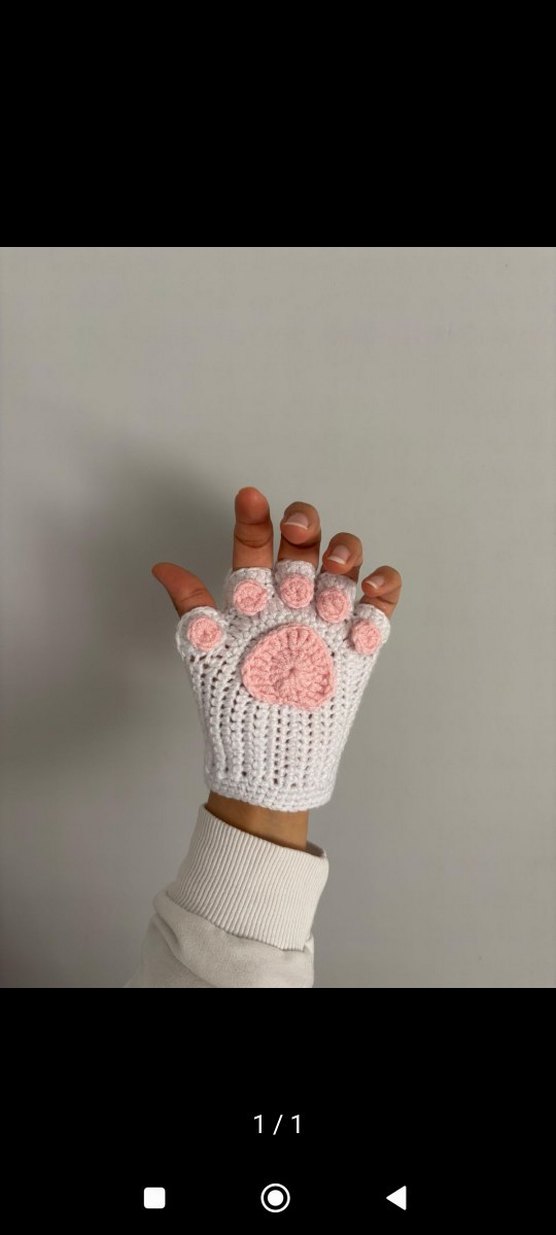 Beyaz ve pastel pembe renkte, örgüden yapılmış parmaksız eldiven. Rahat ve rock punk tarzında, pati desenli şık bir tasarım.