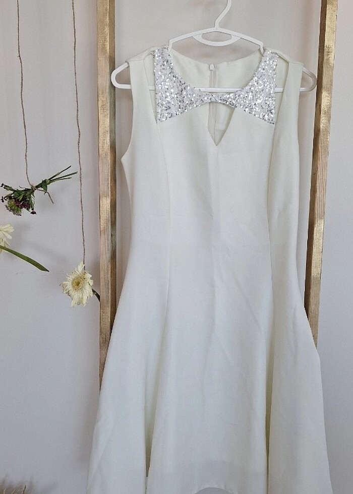 Beyaz renk, yakasında pencere ve pul detayı bulunan, etek ucu hafif geniş gelen, kısa elbise. Sadece mezuniyet balosunda giyildi. Hiçbir kusuru yoktur. Nikahlarda, bride partilerde vb. etkinliklerde kullanılabilir