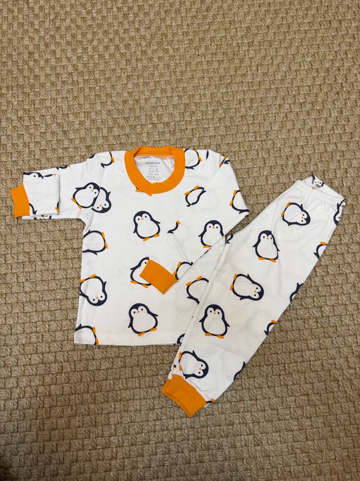 %100 Pamuklu, uzun kollu, turuncu kenarlıklı, penguen desenli beyaz bebek takımı. beden:3 yaşdan 6 yaşa kadar