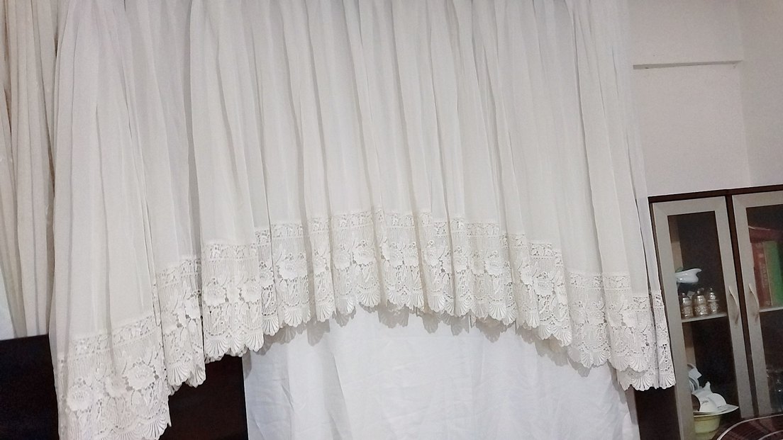 Beyaz perde eni 3.90 cm kenar boyu 1.60 orta boy 2.25 ortası daha kısa oval gibi en kenarda ekstrafor biraz ilave edilmiş kusuru yok güzel perde gugmeleri var apruma düğmeleri bizim kornise uymuyor değiştirebilirsiniz iade yok
