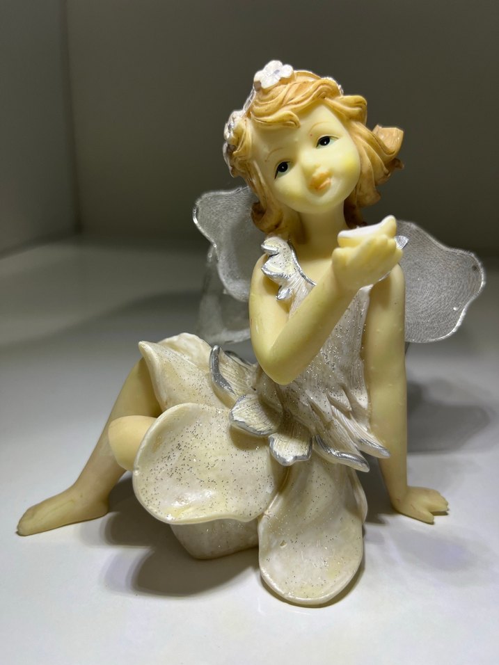 Şeffaf kanatları ve nazik ifadesiyle beyaz peri biblo, hafif renkli yumuşak elbise ile zarifçe oturuyor.