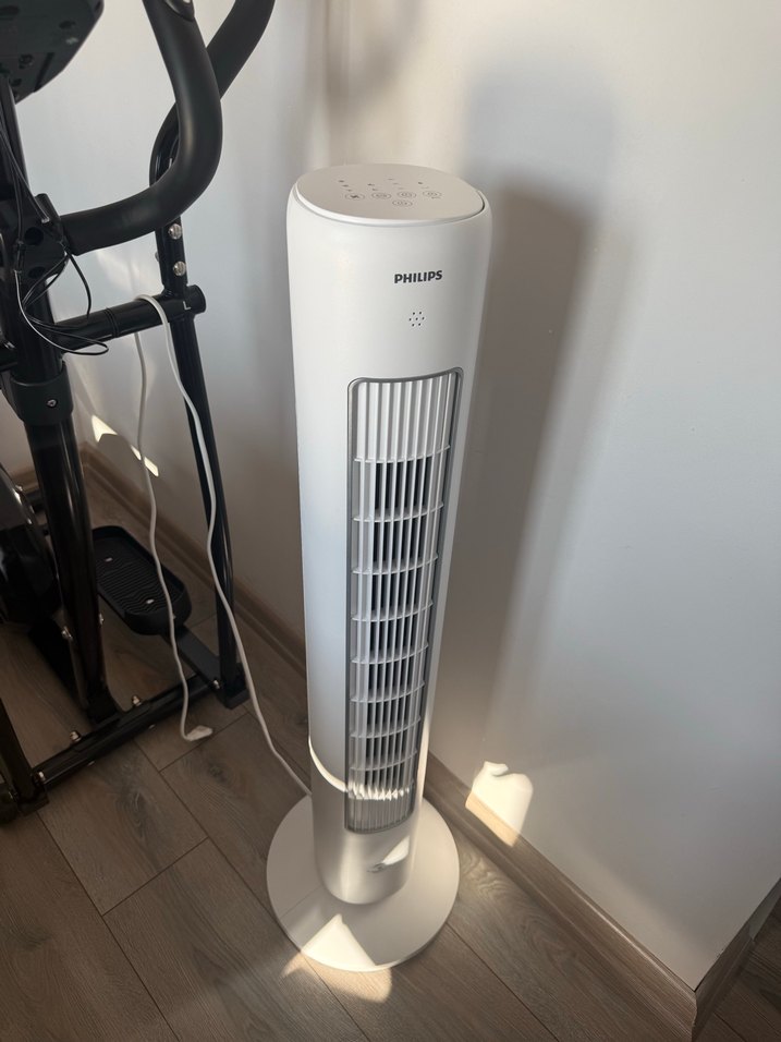 Beyaz renkli Philips dikey vantilatör, ön ızgara ve üstte kolay kullanım için kontrol tuşlarına sahiptir. Etkili hava dolaşımı sağlar. ️