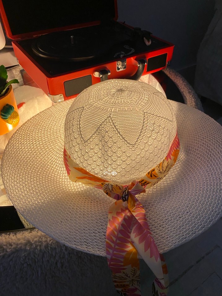 Bohem tarzda, pileli dokuma kumaştan yapılmış, açık beyaz renkte kadın şapkası, renkli desenli fularla süslenmiştir. Kızlar 0 ürün hiç kullanmadım yaz ayları için harika bir şapka