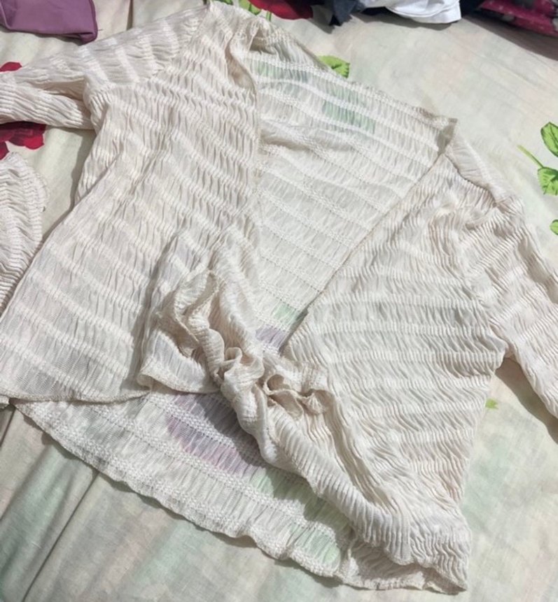 Yumuşak keten kumaştan, beyaz pileli kadın şalı. Bohem tarzı ve pastel tonlarıyla rahat, retro bir görünüm sunar.