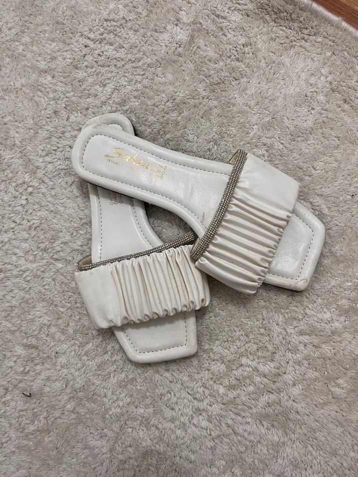 Beyaz renkli, sentetik kumaştan, pileli ve işlemeli detaylara sahip blok topuklu kadın terlik. Günlük kullanıma uygun, rahat ve bohem tarzda.