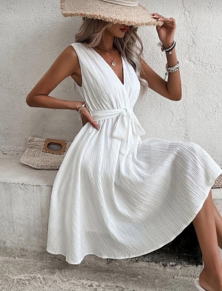 Beyaz, kolsuz, V yakalı mini elbise. Pileli ve bol kesim, hafif keten kumaştan rahat bir görünüm sunar.