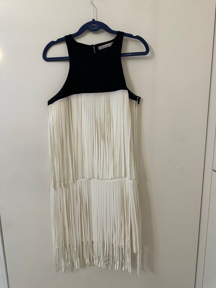 Uzun, fitted kesim beyaz pileli abiye elbise, straplez yaka ve koyu detaylara sahip. Parti için çağdaş, avangard bir stil sunar. Az kullanıldı, şık bir elbise. 38 beden, sadece 2 küçük lekesi var fotoğraflarda gözüküyor
