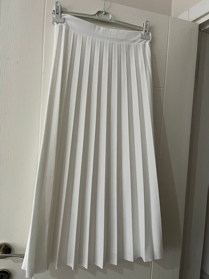 Beyaz uzun pileli etek, düz kesim ve yumuşak sentetik kumaştan yapılmıştır. Minimalist, modern klasik tarzıyla ofis için uygundur.
