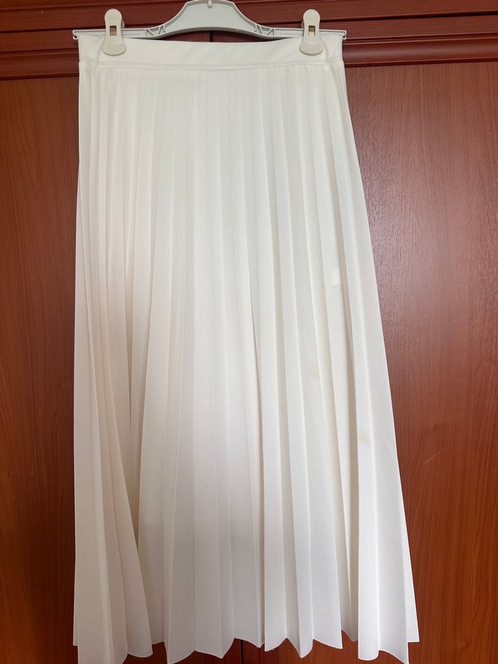 Beyaz renkli, pileli ve regular fit uzun etek, yumuşak sentetik kumaştan üretilmiştir. Minimalist ve sade tasarımıyla ofis için uygundur. Etikette L beden görünüyor ancak kalıbı dar